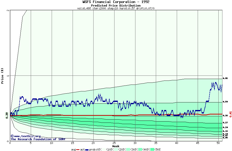 The following graph plots the year-to-date performance of the stock for 1992 compared to the probability calculated by a random walk model.