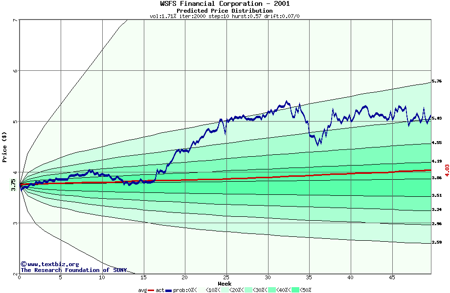 The following graph plots the year-to-date performance of the stock for 2001 compared to the probability calculated by a random walk model.