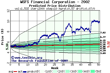 The high to date and low to date prices of the stock plotted against a random walk model for 2002 (what's this?).
