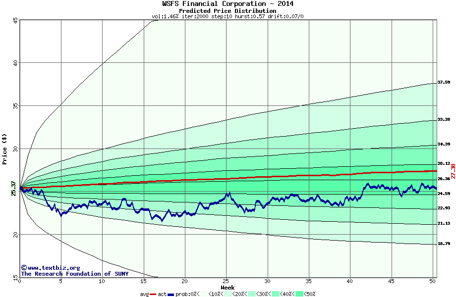 The following graph plots the year-to-date performance of the stock for 2014 compared to the probability calculated by a random walk model.