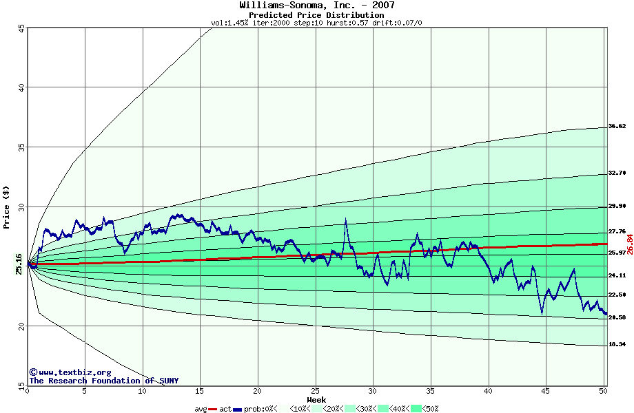 The following graph plots the year-to-date performance of the stock for 2007 compared to the probability calculated by a random walk model.