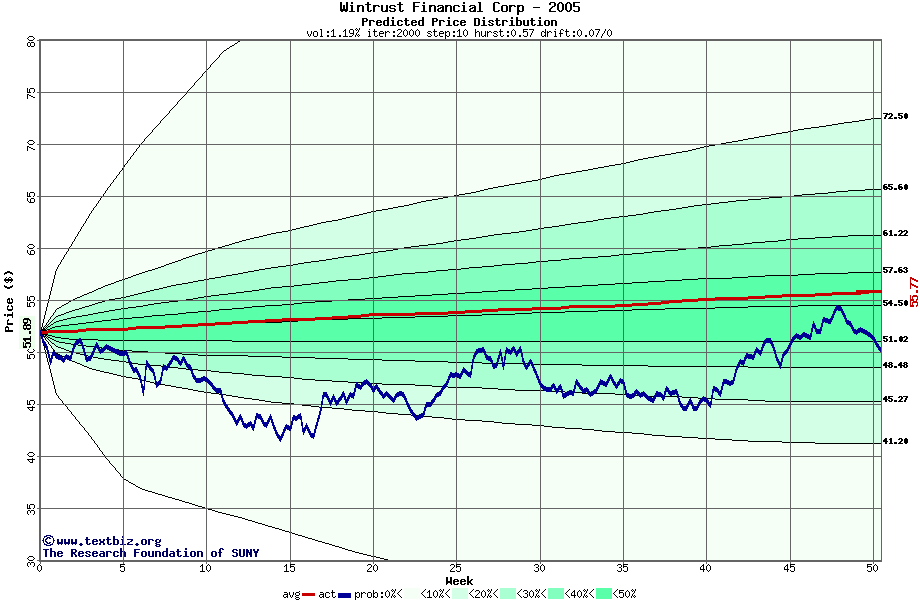 The following graph plots the year-to-date performance of the stock for 2005 compared to the probability calculated by a random walk model.