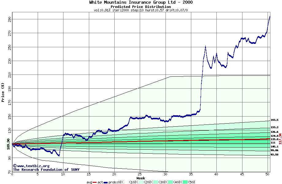 The high to date and low to date prices of the stock plotted against a random walk model for 2000 (what's this?).