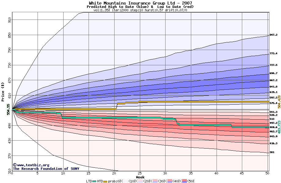 The high to date and low to date prices of the stock plotted against a random walk model for 2007 (what's this?).