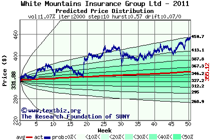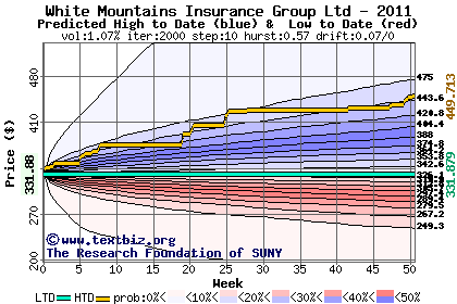 The high to date and low to date prices of the stock plotted against a random walk model for 2011 (what's this?).