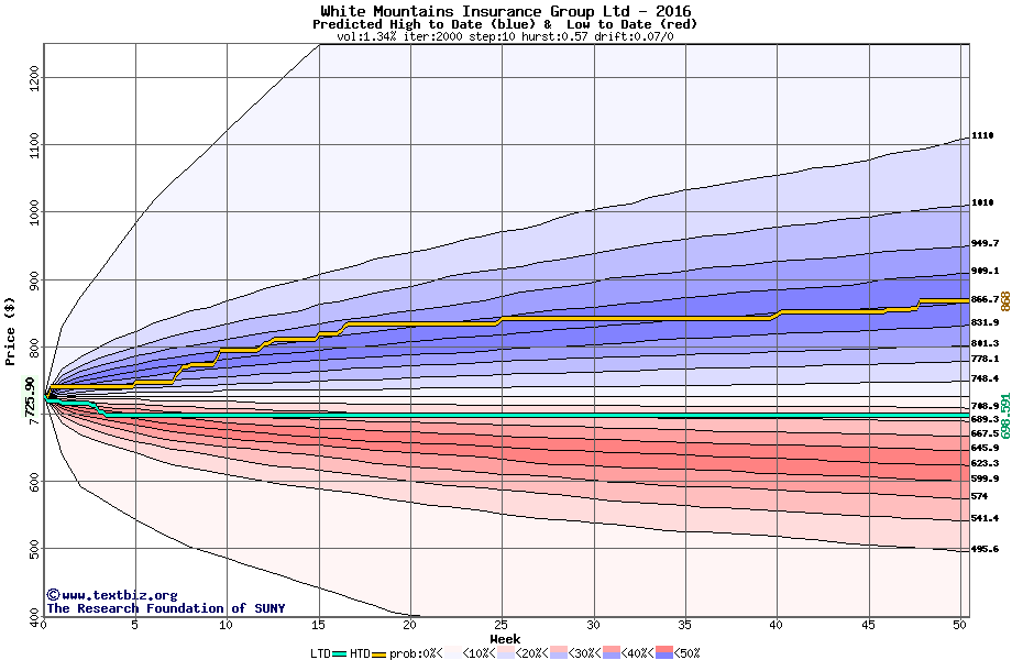 The high to date and low to date prices of the stock plotted against a random walk model for 2016 (what's this?).