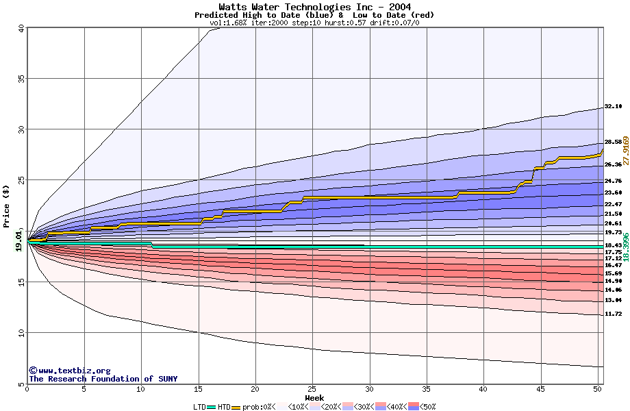 The high to date and low to date prices of the stock plotted against a random walk model for 2004 (what's this?).