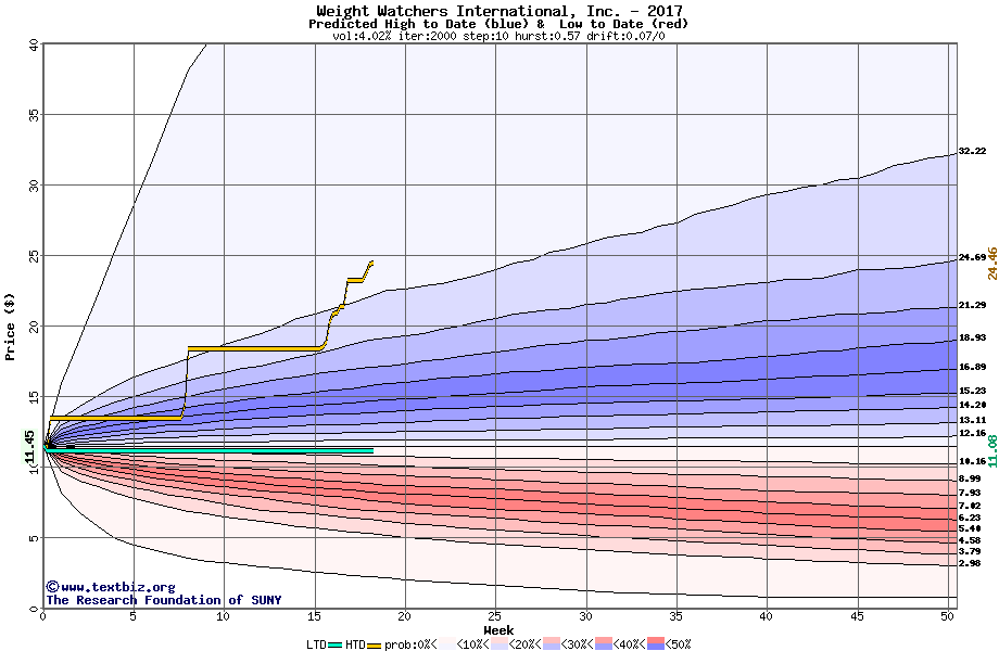 The high to date and low to date prices of the stock plotted against a random walk model for 2017 (what's this?).