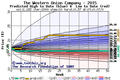 The high to date and low to date prices of the stock plotted against a random walk model for 2015 (what's this?).