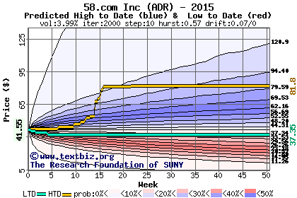 The high to date and low to date prices of the stock plotted against a random walk model for 2015 (what's this?).