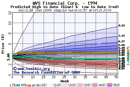 The high to date and low to date prices of the stock plotted against a random walk model for 1994 (what's this?).