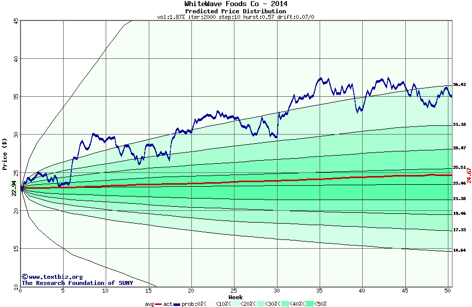 The following graph plots the year-to-date performance of the stock for 2014 compared to the probability calculated by a random walk model.