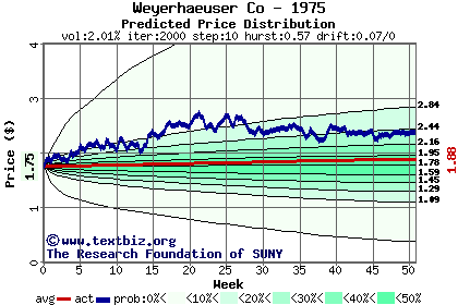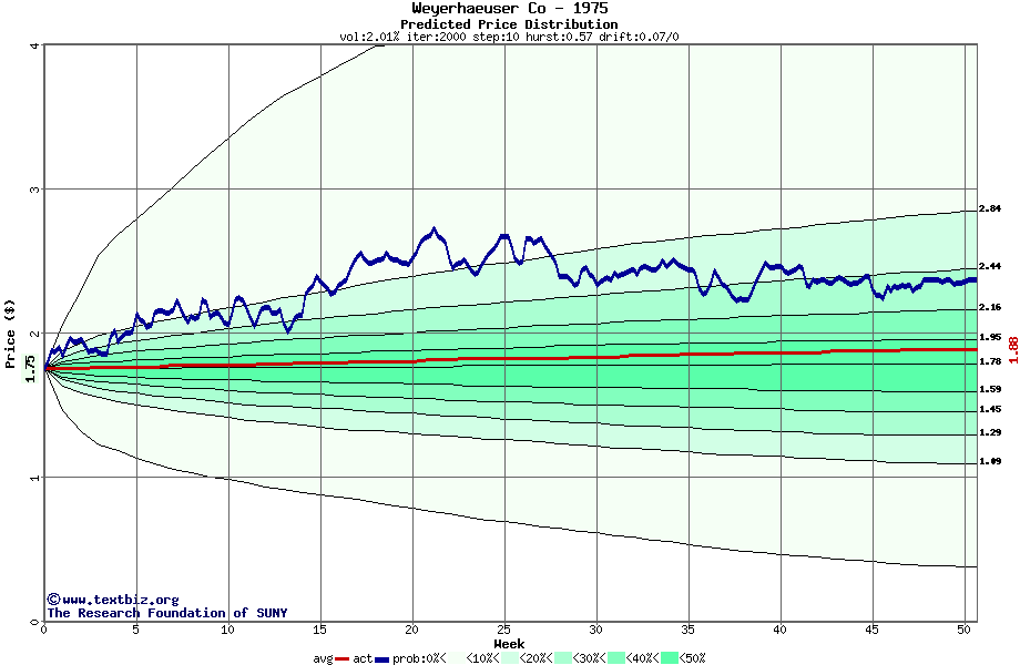 The following graph plots the year-to-date performance of the stock for 1975 compared to the probability calculated by a random walk model.