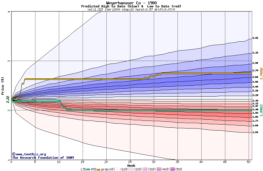 The high to date and low to date prices of the stock plotted against a random walk model for 1980 (what's this?).