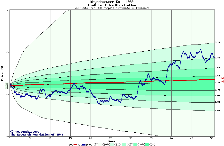 The following graph plots the year-to-date performance of the stock for 1982 compared to the probability calculated by a random walk model.