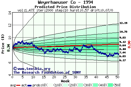 The high to date and low to date prices of the stock plotted against a random walk model for 1994 (what's this?).