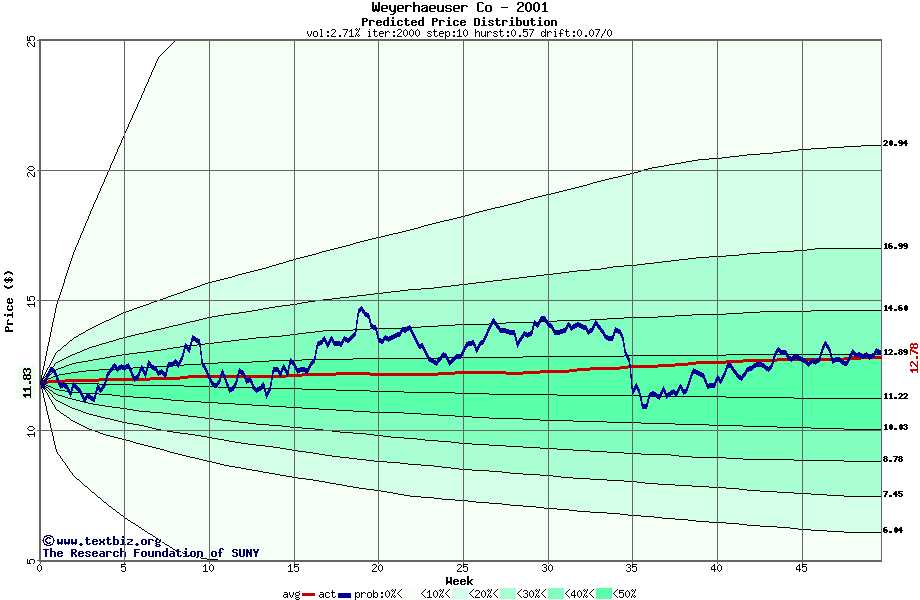 The following graph plots the year-to-date performance of the stock for 2001 compared to the probability calculated by a random walk model.