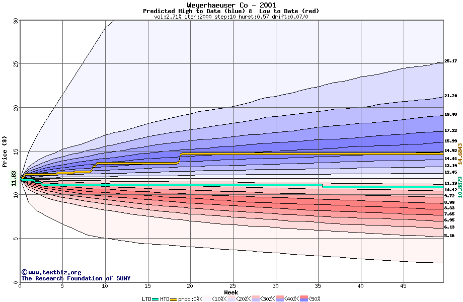 The high to date and low to date prices of the stock plotted against a random walk model for 2001 (what's this?).