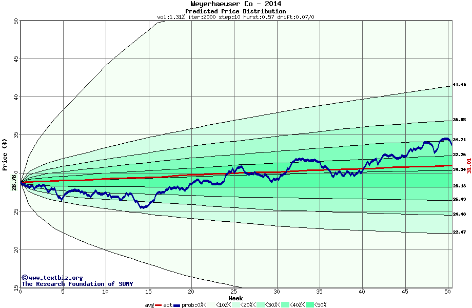 The following graph plots the year-to-date performance of the stock for 2014 compared to the probability calculated by a random walk model.