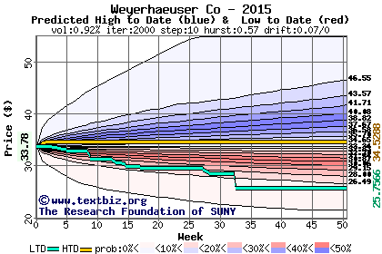The high to date and low to date prices of the stock plotted against a random walk model for 2015 (what's this?).