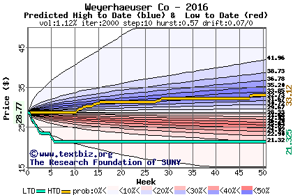The high to date and low to date prices of the stock plotted against a random walk model for 2016 (what's this?).