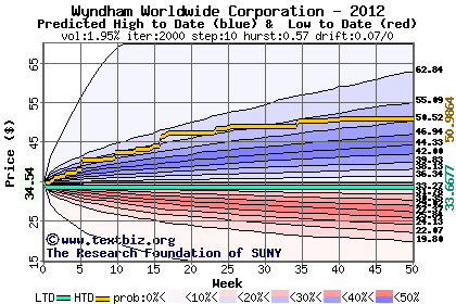 The high to date and low to date prices of the stock plotted against a random walk model for 2012 (what's this?).
