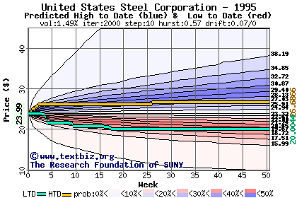 The high to date and low to date prices of the stock plotted against a random walk model for 1995 (what's this?).