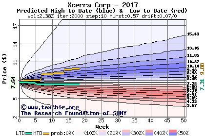The high to date and low to date prices of the stock plotted against a random walk model for 2017 (what's this?).