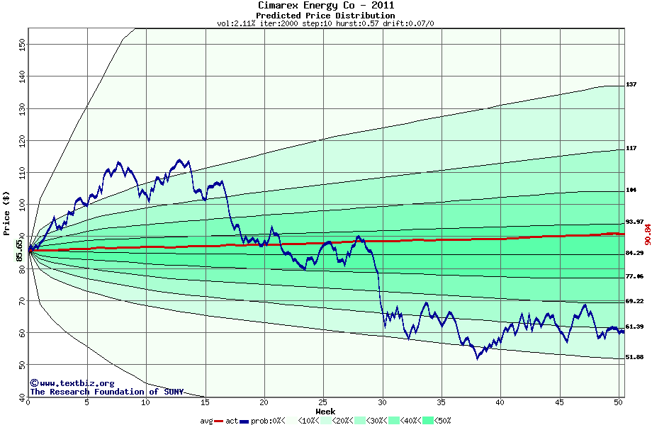 The following graph plots the year-to-date performance of the stock for 2011 compared to the probability calculated by a random walk model.