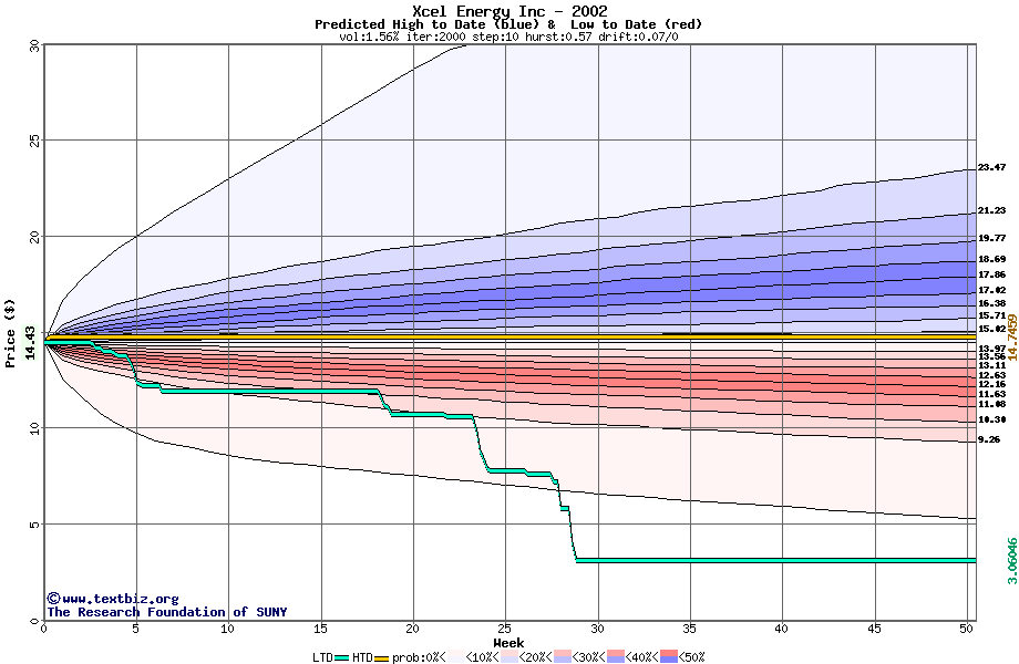 The high to date and low to date prices of the stock plotted against a random walk model for 2002 (what's this?).
