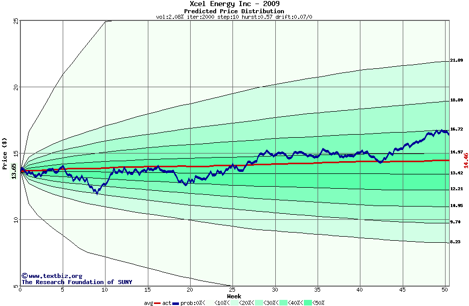 The following graph plots the year-to-date performance of the stock for 2009 compared to the probability calculated by a random walk model.