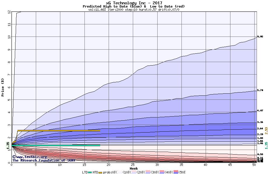 The high to date and low to date prices of the stock plotted against a random walk model for 2017 (what's this?).