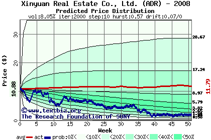 The high to date and low to date prices of the stock plotted against a random walk model for 2008 (what's this?).