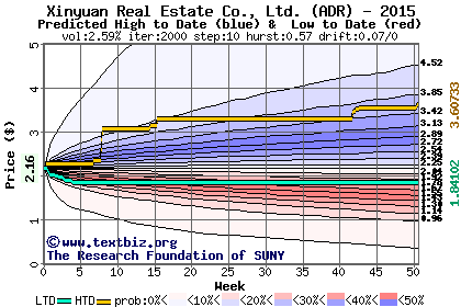 The high to date and low to date prices of the stock plotted against a random walk model for 2015 (what's this?).