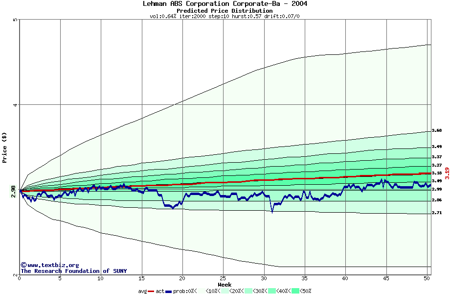 The high to date and low to date prices of the stock plotted against a random walk model for 2004 (what's this?).