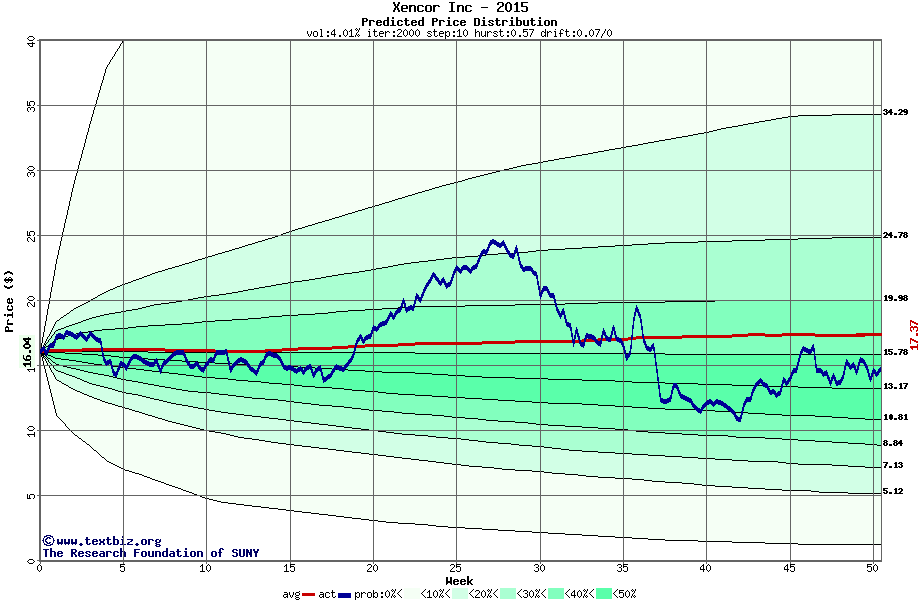 The following graph plots the year-to-date performance of the stock for 2015 compared to the probability calculated by a random walk model.