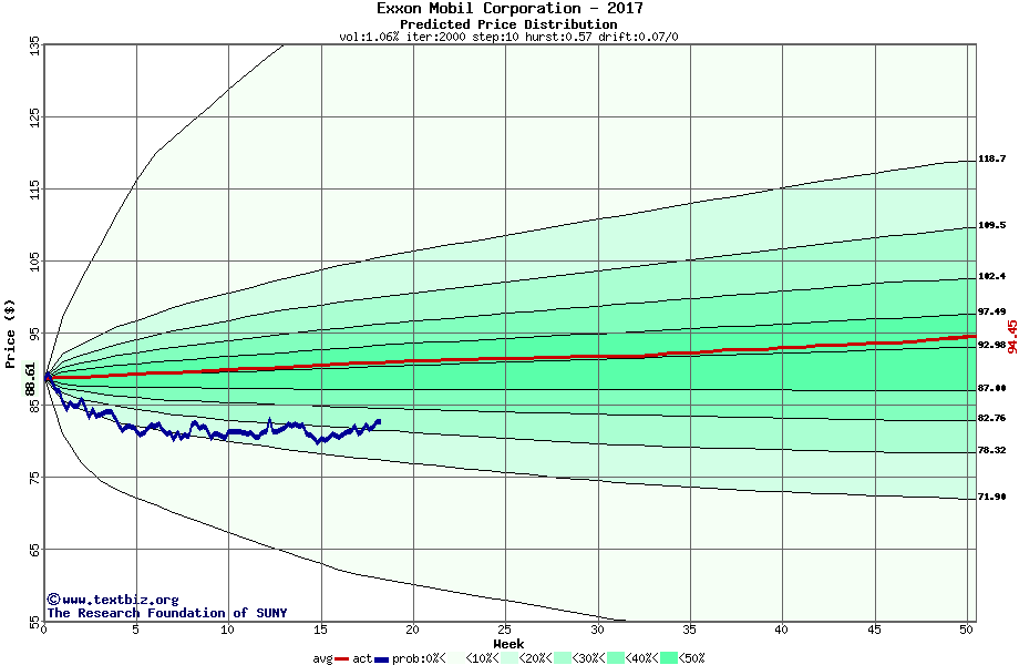 The following graph plots the year-to-date performance of the stock for 2017 compared to the probability calculated by a random walk model.