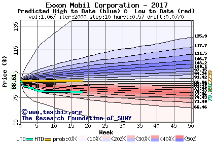 The high to date and low to date prices of the stock plotted against a random walk model for 2017 (what's this?).