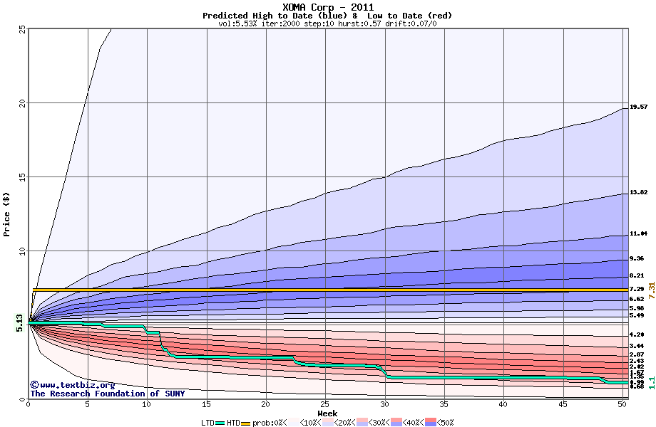 The high to date and low to date prices of the stock plotted against a random walk model for 2011 (what's this?).