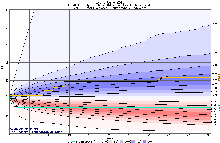 The high to date and low to date prices of the stock plotted against a random walk model for 2016 (what's this?).