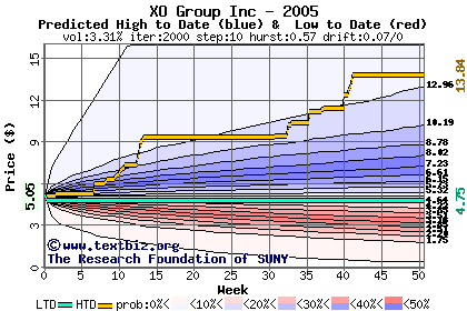 The high to date and low to date prices of the stock plotted against a random walk model for 2005 (what's this?).