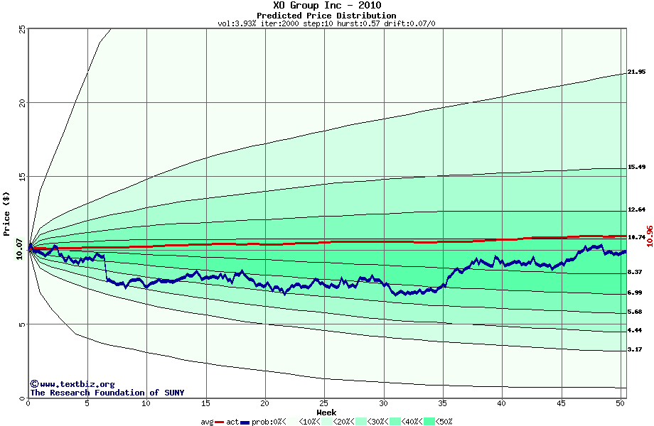 The following graph plots the year-to-date performance of the stock for 2010 compared to the probability calculated by a random walk model.