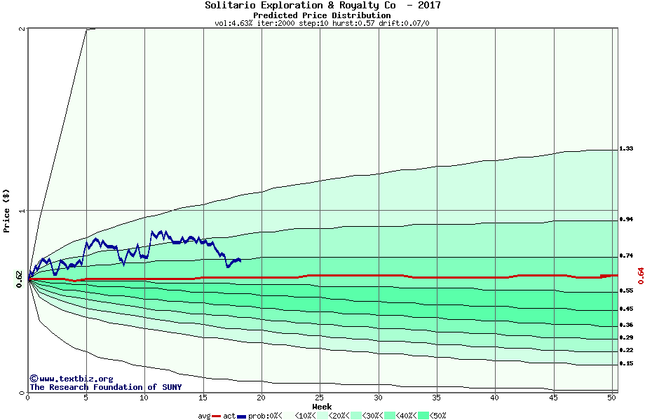 The high to date and low to date prices of the stock plotted against a random walk model for 2017 (what's this?).