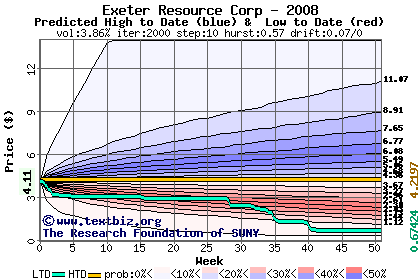 The high to date and low to date prices of the stock plotted against a random walk model for 2008 (what's this?).
