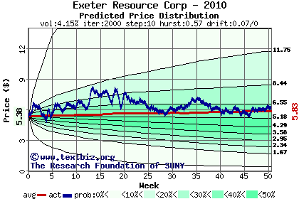 The high to date and low to date prices of the stock plotted against a random walk model for 2010 (what's this?).
