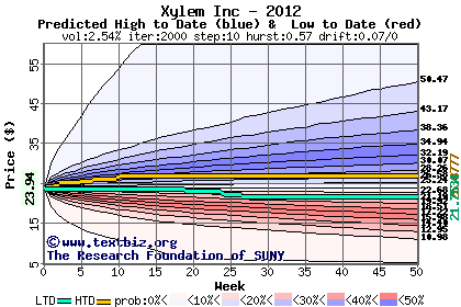The high to date and low to date prices of the stock plotted against a random walk model for 2012 (what's this?).