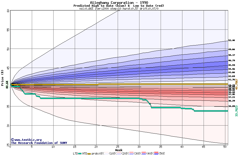 The high to date and low to date prices of the stock plotted against a random walk model for 1990 (what's this?).