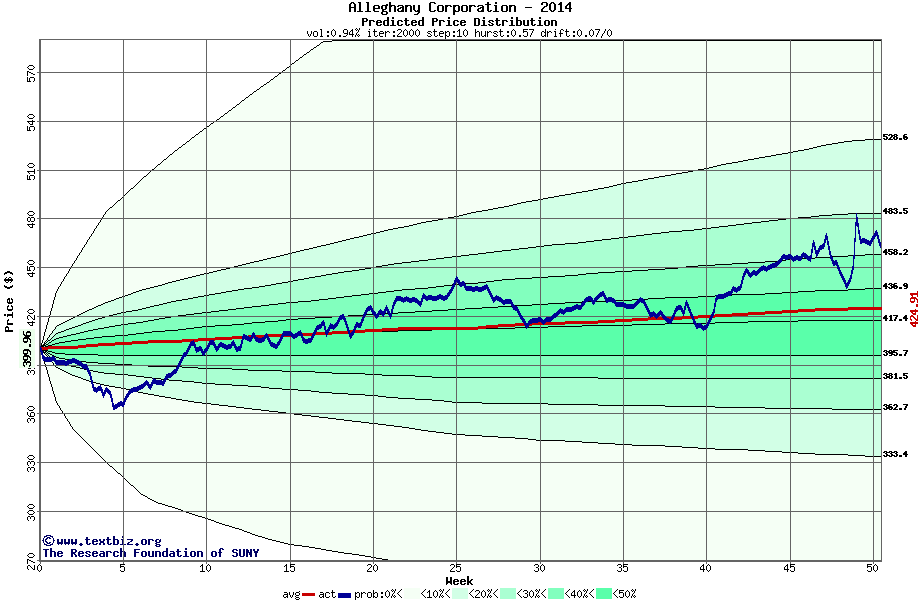 The following graph plots the year-to-date performance of the stock for 2014 compared to the probability calculated by a random walk model.