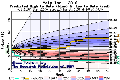 The high to date and low to date prices of the stock plotted against a random walk model for 2016 (what's this?).