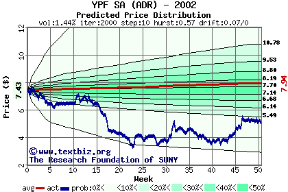 The high to date and low to date prices of the stock plotted against a random walk model for 2002 (what's this?).